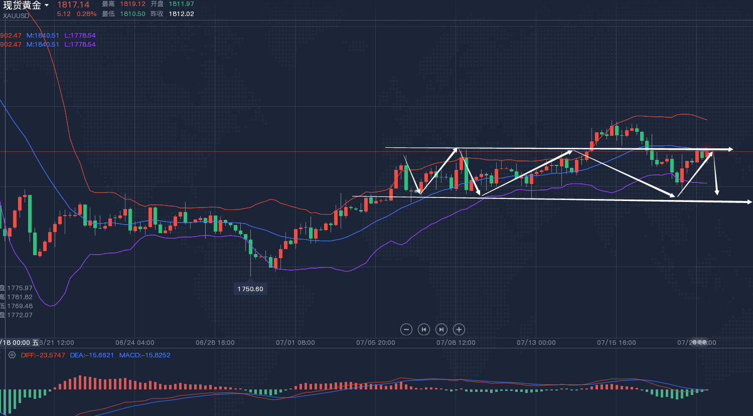 投资犹如下棋,棋艺高者能看出五步,七步甚至十几步,而棋艺低者只能看出两三步,高者顾大局,谋大势,不以一子一地为重,以最终赢棋为目标;低者则寸土必争,只为争一时之需,结果频频受困。趋势,一定要有长远眼光,投资,一定要有长远规划,而布局技巧是成功的关键。做投资,如果你的能力不足以支撑你现在的状况,那么你需要一位军师助你操控大局,一次选择,就是一次转折!一次尝试,就是一次机会! 【黄金行情走势分析】 周四(7月22日)金价徘徊于1800关口附近。黄金从技术面看,从趋势的定义来看,短期的调整仍然是次级调整,因为周图的上升态势不变,价格仍然是运行于短期均线上方,而日图价格在1834调整有40块了,也回