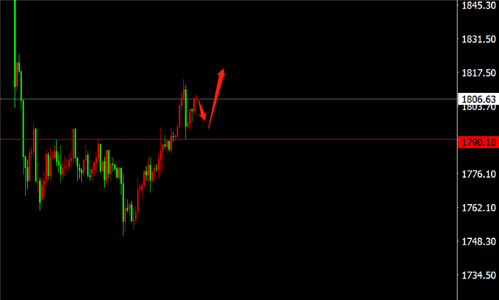 过去的不过度沉迷,未来的不过分要求,把握当下才是关键,不要还沉迷于上周的赢亏之中,走过的行情无需去感叹,既然是新一天的开始,那我们就应该以全新的面孔来面对接下来的每个交易日,虽然方锦鑫非常了解你们此刻的心情,赚钱的投资者此时肯定是信心满满,但存在亏损的你此刻肯定是非常的沮丧、着急甚至对这个投资市场已经失去信心,但投资市场就是这样,有赢就有亏。 今天周一,现货金亚洲盘冲高1810后再次走弱,午后一度跌破1800大关,但随后再次攀升,区间震荡区域尚未打破,短线方向不明。黄金(GOLD)上周五打破下行拐点连线的动能,重新回归平行区间震荡区间,今天黄金价格早间偏空运行,当前金价挑战1800附近支撑,