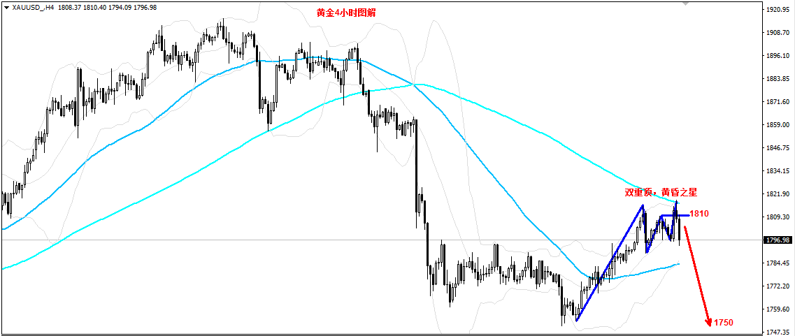 实力是盈利的基础,稳健是获利的根本!大家好,我依然是活跃在投资一线的黄金分析师方锦鑫。有句话说的好箭在弦上不得不发,黄金投资也一样,既然进入市场必定不能无功而返,做投资不是一朝一夕的事,没有一条路走到黑的行情,更没有一直亏损的投资,行情反反复复,操作亏亏赚赚,这个市场不会偏袒任何人,一时的亏赚并不能决定成败,亏损了就赚回来,谁笑到最后才是赢家。 金价盘中跌破日内低点1796,日K线由阳转阴,走势正式宣告转空了。也就是说自1750到1818这一个波段上涨已经结束。至于后面会不会先回撤之后在继续涨到1850一线,需要出现更多信息信号才能判断。不过,笔者现在的判断是,波段上涨已经明确结束。 4小时