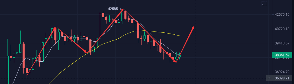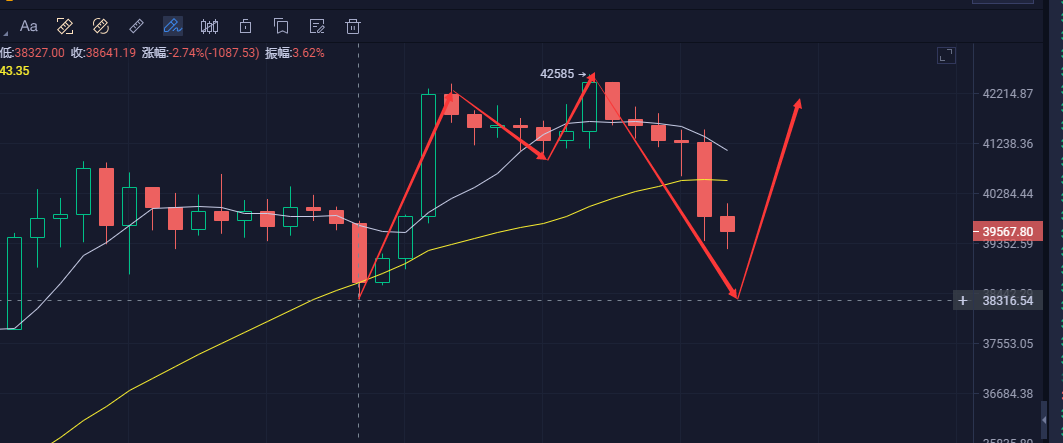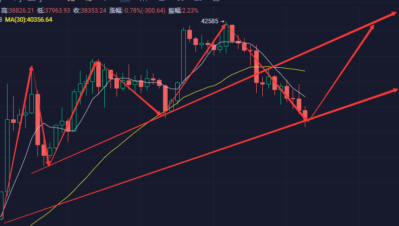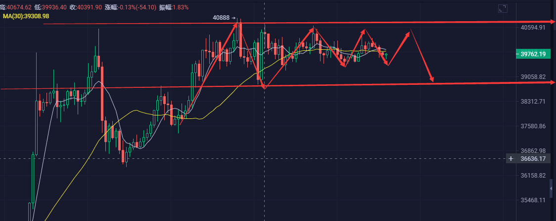 金融投资市场上,最大的财富往往是在最后,因为最后的是复利的结果,而复利的前提,是你的持仓,如果你不持仓,就没有复利,持仓就是用时间的积累,换取复利的结果 昨天周三,比特币继续着一个星期以来的走势,连续的强势上涨!唯一的不同是美盘突破新高 40900 之后走了个快速下跌,之后凌晨再来了过山车的行情,凌晨就一根大阴线跌到 38800 ,让做凌晨形态循环多单的人直接扫了止损,但美盘前的冲高,让笔者坚决 4 万上方的位置会迎来下跌,预期的低点在 39000 的区域,空头的力度完全在我的预期之内! 很多投资者,并不是专职于交易,尤其不是长线持仓的心态和资金,对当下行情的把握显的尤其关键。由于长