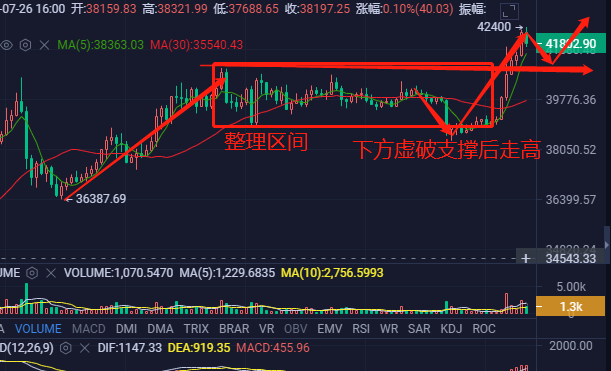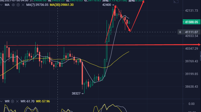 你永远不知道意外和惊喜那个先到来,继白天的大幅回调下跌之后,凌晨比特币以太坊纷纷再次拉高上涨刷新高点,比特币涨幅相对较大最高升至42400一线,以太坊也是再次突破刷新出来2470的高点,看似无厘头的上涨是否有迹可循呢,不是大幅下跌转空头了?很多投资朋友都有不小的疑问,对于老李来说此次上涨不算意外,可以说是惊喜,为什么说是惊喜呢?相信晚间有看过老李文章的朋友心里应该是有数的,知道后市要涨上去测试高点,但涨幅这么大还是有些惊喜的,晚间跟着老李文章在回落之后做多的朋友相信收益最少也有1000多个点吧。 至于为什么在大幅回撤之后还坚持看多,很简单,大趋势处于明显的多头方向,而且日线九连阳之后走一步像