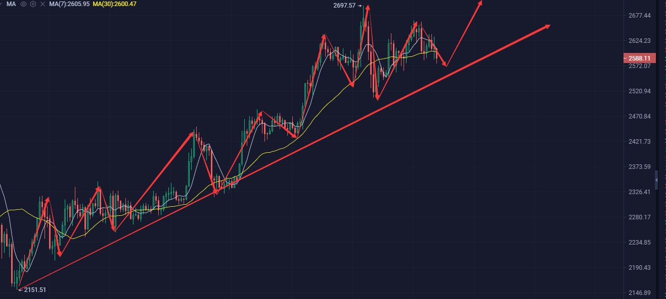周末市场再次给大家开了个玩笑,凌晨开始以太坊开始单边上涨连续破位,不断刷新高点,上方2600的关口被一举突破,经过一番调整之后以太又继续走高然后再次刷新了日内高点,最高涨至2700整数关口,随后开始大幅回撤调整直到现在,日线最终收阳。不同于以太坊的大幅上涨不断破位,日内比特币最高涨至42585一线,随后自高点位置开始整理下跌,没有二次刷新高点,并且日线最终收阴。整体来看,比特币走势 目前相对来说 弱势一些,貌似开始和以太坊分道扬镳了,事实是否真的如此呢?甚至是很多人怀疑否是行情开始到顶开始走低了呢? 其实没必要纠结,目前整体趋势目前还是明显多头运行当中,现在相对来说是高位开始走震荡调整,连续