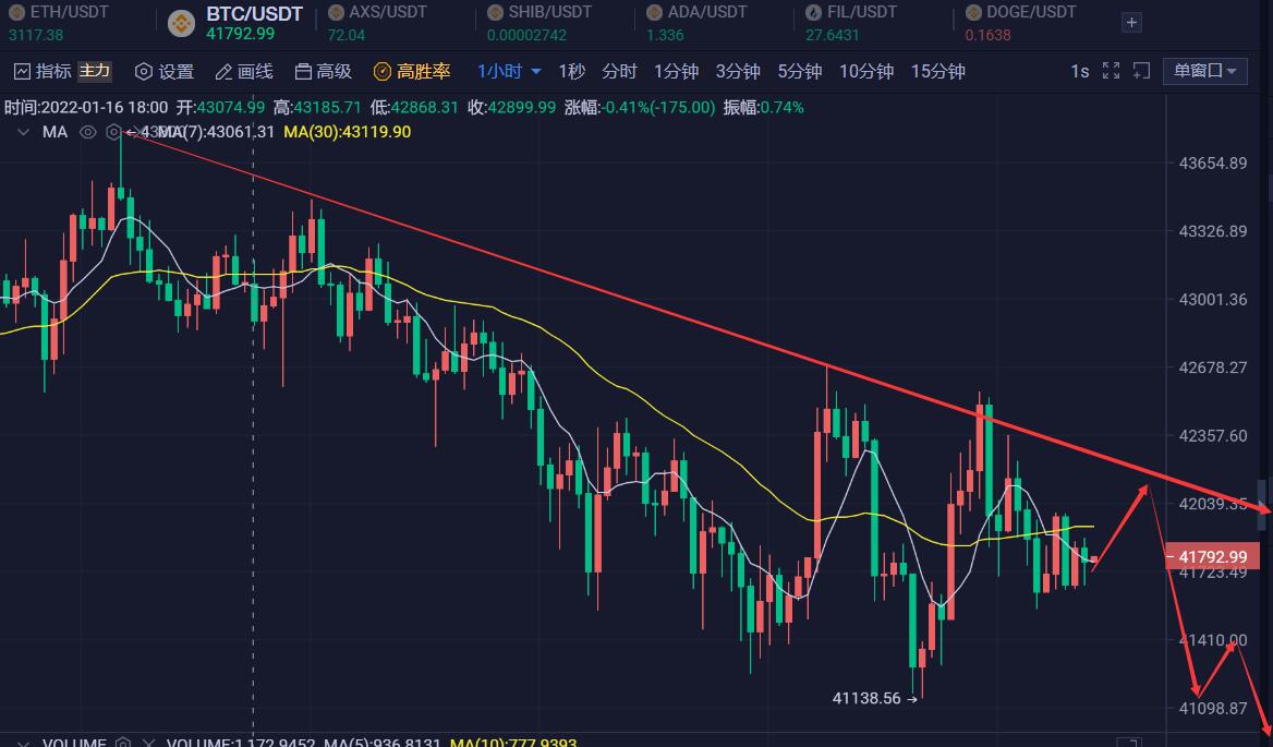 连续两天比特币以太坊不断走低,前面的反弹涨幅不光全部跌没,而且盘中还不断在试探新低,这就是弱势行情的最好表现,行情走出来之前作出预判,等行情走出来之后也就不会后悔,这两天我们给出的方向行选择已经得到了验证,也证明了咱们做空的思路是完全正确的,现阶段不管是大饼还是以太走势都已经足够弱势了,现如今关注点就该放在整数关口支撑能否破位上了,也就是大饼看4万关口,以太看3000关口能否跌破位了,阶段性给出的目标正一步步达成,先不说行情能不能跌破位不谈,最起码再次测试下方整数关口支撑是大概率事件。 目前来看,今天大饼整体思路还是反弹做空为主,小时线看走出较为明显的下行通道出来,操作上面也就围绕着下行通道