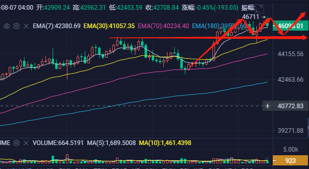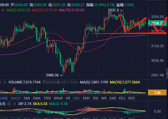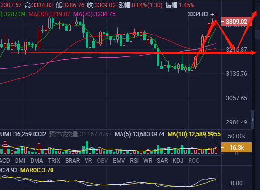 还是熟悉的多空转换,继周六日线收阴之后,昨天市场再次走出来一波探底回升日线转阳,这就是震荡行情的明显特征,多空转换行情涨跌反转较快,追着行情跑的话吃亏成必然,还不如守住支撑去做好一个方向来的稳,老刘昨天是这么说的,也同样是这么做的,虽然日内下跌的幅度大那么一点,但是老刘这边也没有动摇,最终也算是守得云开见月明。早间以太坊再次测试了新高,比特币还没有走出明显的探顶,相对来说还是以太坊走在前面,接下来行情怎么走往哪个方向去走是关键,也是市场上面普遍关心的问题。 比特币整体方向上面没有问题,虽说早间没有走出刷新高点尝试突破的拉升,但昨日同样的回落幅度也没多大,整体还是在一个可控范围内走的比较稳,探