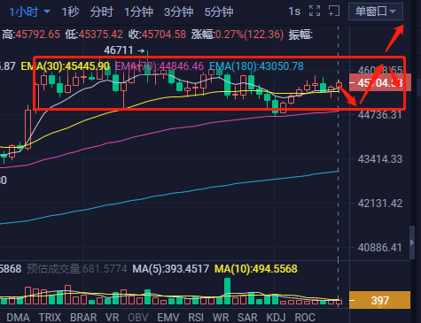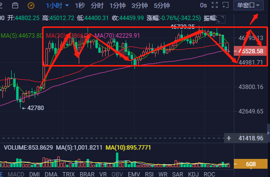 临近高位之后比特币以太坊纷纷走调整,前面连续不断新高的势头有所放缓,昨日比特币没有再次突破高点整走出较为明显的区间震荡,以太坊稍显强势,盘中在冲破新高之后回落下来,依旧维持在较为明显的高位震荡区间运行,短期内看来需要再次打破震荡区间走出方向才有新的单边走出来。较为明显的震荡运行行情多空都有机会,但相对来说老刘更喜欢跟着大趋势走,等回落支撑位置附近去干多,一贯如此。 大方向上面来看多头趋势依然没有改变,比特币虽然昨日没能突破上方高点46711一线,但是下方回落也还是在支撑位置企稳后又开始走高,走出较为明显的箱体运行空间,短期内行情依然还是在这个明显的区间内运行,就看何时做出方向性选择了。时间上