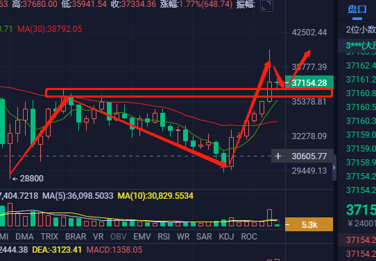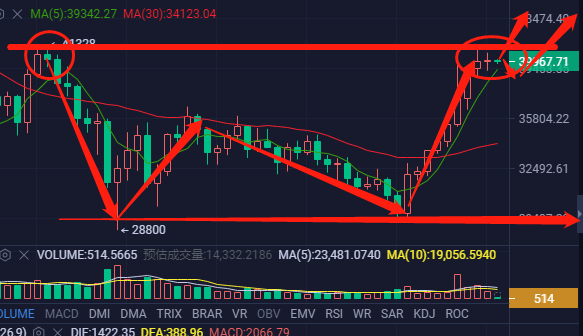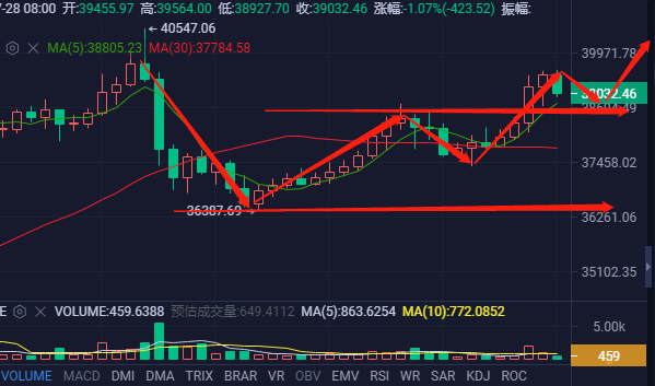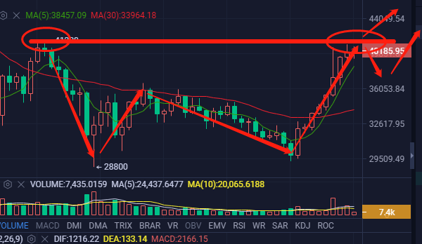当你走进市场就要做好准备,如果你只是个看客就不要轻易尝试,投资有风险既要谨慎也要果敢,要想抓住机会,就要勇于尝试。行情瞬息万变,合理控制好仓位,切勿重仓或满仓操作,做单请带好止损。一路艰辛一路风景,不忘初心,方得始终。 比特币日线走势,从5月19号开始,一直走的是个大型箱型震荡,上方高点是41000,从整体走势来看均线压力线还是存在的,现在市场形势像是在等比特币上涨来恢复,41000短期有一定压制,所以晚间才会回踩一下,回踩之后企稳,之后大概率会继续震荡然后走出突破方向,箱体运行的话在低点的时候可以果敢点进场,到高点就要控制好尽量把仓位降低,然后就要多头转向空头,多空轮转,下午的大幅回撤做空