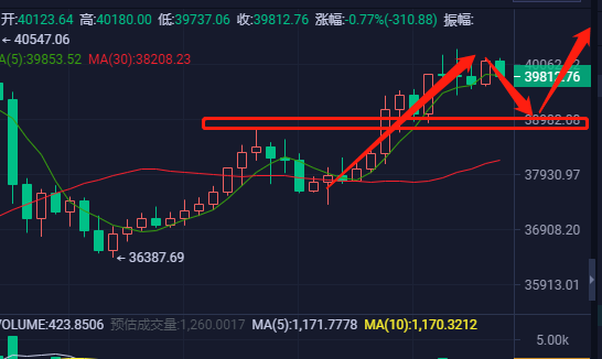首先在这里先恭喜这几日跟着老刘从29000和1730开始干多比特币以太坊的朋友,多单完美斩获上万余点出局!尽管昨日早盘冲高后回撤,但依旧没有破位整体的上涨趋势,日线再次收阳,目前日线已经连续8天收阳,大趋势看多依旧不变。 比特币:对于比特币行情而言只能用一句话来形容“假消息真突破”一个假利好的消息直接点燃了整个市场的情绪,市场多头开始发力,上午比特币在拉升到40500关口后又回落至39700附近,但大家不要担心价格会再次大幅度回落,拉升之后有小幅回调是很正常的,操作方面建议回落39200-38800继续进场多单,防守位置同样放在37500下方就好。大趋势多头方向依旧不变,目前市场恐慌度也有好