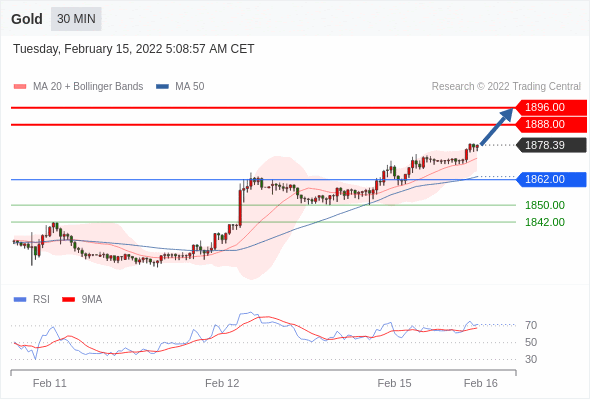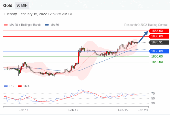 黄金现货 当日内: 朝1888.00运行。 转折点:1859.00 交易策略:在 1859.00 之上,看涨,目标价位为 1879.00 ,然后为 1888.00 。 备选策略:在 1859.00 下,看空,目标价位定在 1850.00 ,然后为 1844.00。 技术点评:RSI技术指标看涨,有进一步向上趋势。 美国原油 (WTI) 期货 (H2) 当日内: 短期关键阻力位在92.50。 转折点: 92.50 交易策略: 在 92.50 之下,看跌,目标价位为 90.00 ,然后为 89.00 。 备选策略: 在 92.50 上,看涨,目标价位定在 93.30 ,然后为 94.00。