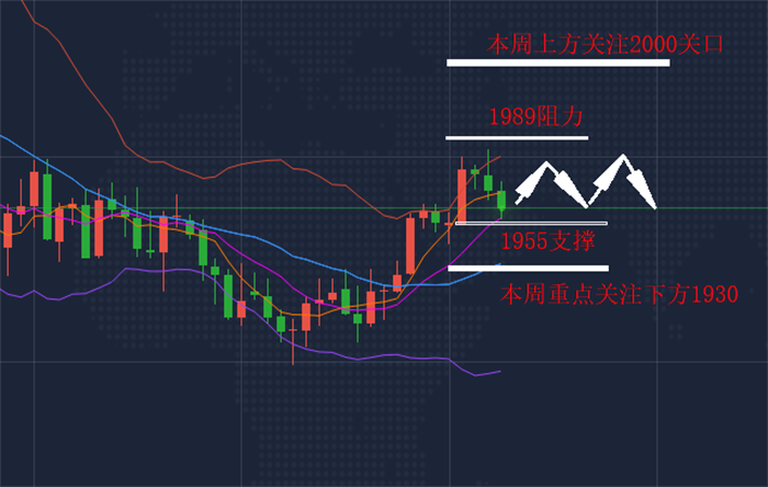 每逢周末,人总是很轻松,本周已过,行情停止。周末放松,领着老婆孩子出去转转,亲近大自然,吸收大自然灵气与精华,人与自然和谐相处,心态变年轻,人与风景混为一体,亲收自然的清新与活力,你将会变得更年轻。 本周总结:黄金本周整体呈现拉升的态势,继1945一路上涨至1987一线承压,本周涨幅42美金,周线收阳。周一行情上下徘徊调整,日线收十字阳,周二受美国6月零售销售月率俗称恐怖数据利多黄金暴涨,上破1983关键压力位,日线收大阳线,周三行情上下徘徊,日线收十字阴,周四延续上涨态势继续破新高开始回调,日线收阴,周五延续下跌态势,日线收上下影线的阴线。 下周展望:周线连续三阳走势,本周由于美国6月零售