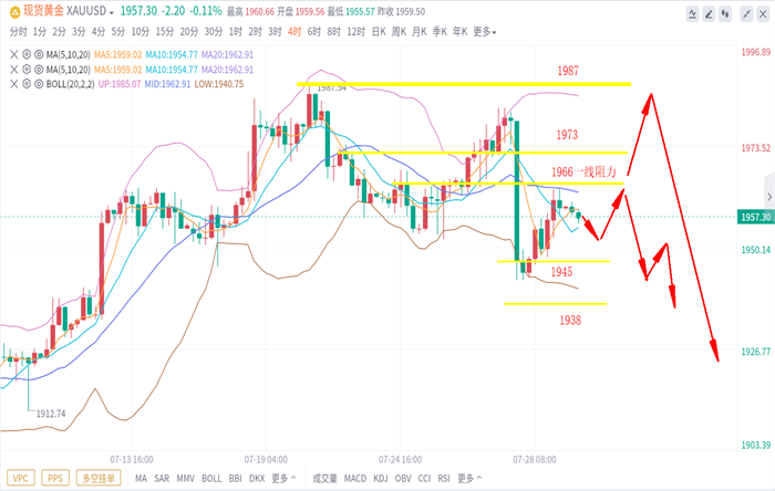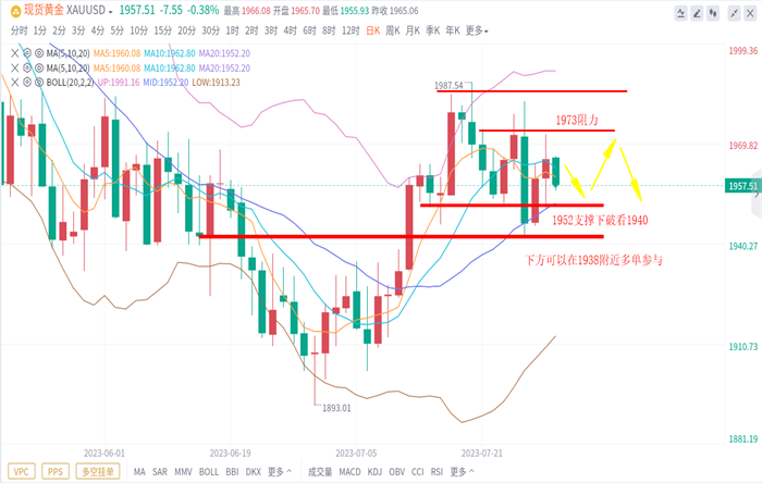 新的一周,新的开始,不论本周你遇到了什么,鸿洋想告诉大家,过去已经过去,我们能做的就是珍惜现在,保持自己的信仰,朝着自己期待的未来努力奋斗,相信自己,只管向前,终有一天你会面朝大海,春暖花开。希望大家都可以爱自己,做最好的自己。 基本消息面解析: 7月31日周一现货黄金小幅走弱,目前交投于1956附近,虽然美国通胀增速放缓,但仍高于美联储2%的目标,市场对美国11月份再加息25个基点的预期有所回升,目前利率期货显示美联储11月份加息概率在35%附近,美元指数相对坚挺,令金价承压,短线金价技术面略微偏向空头,需要提防金价的进一步下行风险。需要提醒的是,本交易日是7月份最后一个交易日,投资者需要