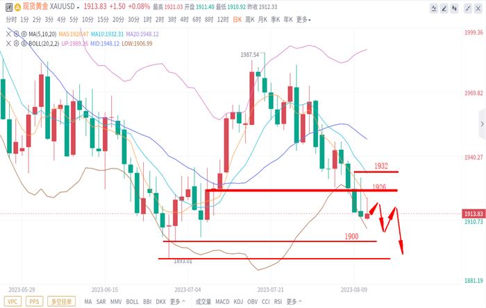 黄金市场是全球人参与的市场,黄金市场是牵动每个投资神经的市场,黄金市场是多空资本博弈市场,市场的趋势就象波浪一样,如山绵绵不绝,如大海波起伏不定,每一个波段总是有波峰和波谷,一个波浪接着一个波浪,驾驶着船顺着波浪在大海中前行,而我们是舵手,我们眼前看见了大海,看到了波浪,我们在大海中行驶,跟着波浪前行,这就够了。 基本消息面解析: 8月4日周五现货黄金在近三周低位窄幅震荡,目前交投于1935附近,隔夜美国经济数据基本符合预期,多数投资者等待美国7月份非农就业报告的出炉。不过,市场普遍对美国就业市场持乐观预期,这帮助美债收益率继续冲高,10年期国债收益率刷新近10个月高点,这令金价后市仍面临进