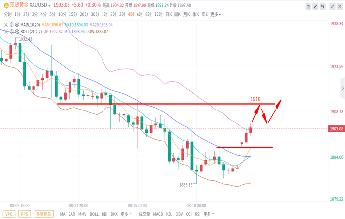 现货黄金: 日线双阳线强势反弹收复失地,双阳吞双阴。K线形态偏反弹,结构上二次冲高1900关口,局部以双底回升的可能,颈线临界点在1916,突破颈线才能完成底部回升。黄金本周低位反弹回升收复失地,周线触及1900关口,二次下探前期低点启稳回升,最终收盘在高位1895上方。日线的收盘回归的区间拉锯。下方二次稳固了1885的支撑,后期若是不破。不排除会局部构造底部,当然还需要形态上的确认,上方压制临界点在1916,站上此位就会提前结束调整格局,形成筑底上升,目前还处于大区间内震荡待选择方向。 目前4小时一波底部连阳式反弹收复,经过二次回踩确认,连整理边蓄势向上的的走法,目前重新回到此前的区间。前