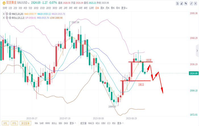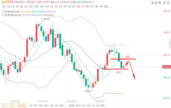 黄金: 黄金上周五最高触及1953承压之后,本周三个交易日一直处于弱势下跌中,金价目前报价于1919附近,昨日尾盘反弹1920后一直处在1915-1920区域徘徊。昨日金价继续承压下跌,在巨量抛盘打压下一度下跌至1915的位置,收复近期部分失地。金价重新下跌至布林中轨1915的位置,回落1920下方,短线上涨形态被破坏,进入下跌通道内,这个下跌我们依然定义为大周期上涨过程中的回落,而不是主节奏的运行,属于次级调整。本交易日目前暂时维持窄幅震荡,重点关注晚间美盘初请数据。 目前黄金三个交易日连续下跌,走了三个低点,和前面的一波下跌非常类似,一但跌破支撑位,短期反弹趋势暂缓,开始新的下跌。我们依