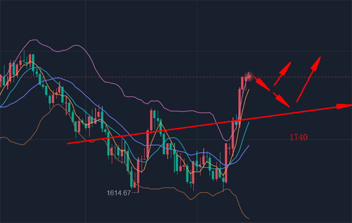 黄金走势分析: 黄金昨天整体走势很强,亚欧盘震荡之后美盘在数据的利多刺激下,出现大幅上涨,强势拉升接近50美金,引爆了多头的情绪,周线上并没有在中轨位置收到压制,而是有效的上破站稳,均线也是形成金叉,那么后市可以看向上轨附近。而日线上,均线依然是都头排列,只不过价格有点偏离均线过远,我们不追涨,行情有可能会出现技术面的调整,要么是回落,要么是震荡修正,所以做多要等回撤卡好点位,不然进场被震荡的难受。 目前4小时图依托中轨做多头强弱分界点,回调空间小,以横向整理代替了回调,目前第三小姐放量之后。已经甩开中轨较远距离,短线依旧是多头延伸当中,可能会伴随回撤确认,但趋势已经形成向上,主思路维持回调