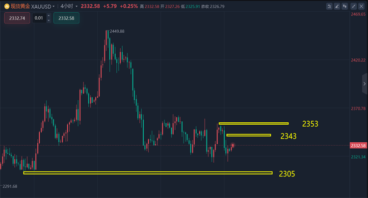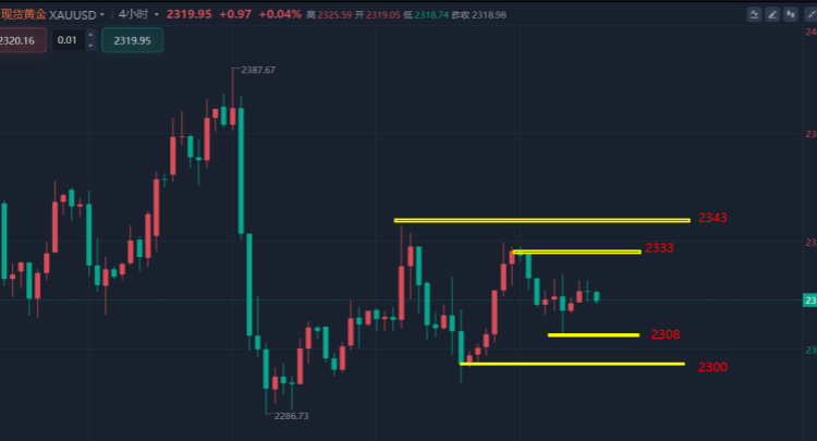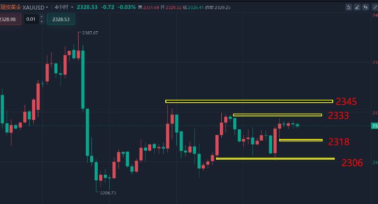这个市场,验证了人心,见证了人性,笔者的文字不华丽,但是却很真诚,记住盈利的投资者是一个旅程,而非目的地。试着每天交易的更好一些,从自己的进步中得到乐趣。聚精会神学习技术分析的技艺,提高自己的交易技巧,而不是仅仅把注意力放在自己交易输赢多少上。同时亏损的投资者要保持一颗良好的心态勇敢的去面对这个市场,选择大于努力,选择比努力更重要!今天的选择或许就是明天的转折。 黄金 从技术面上来看,昨日现货黄金于2310止跌并反弹,最高触及到2341,如果单从这样的反弹力度来说,应该是有利多头,但是,由于这波反弹是借助了CPI利多影响,因此我们看到尾盘金价还是以一根带有上影线的小阳报收于2324附近。而随