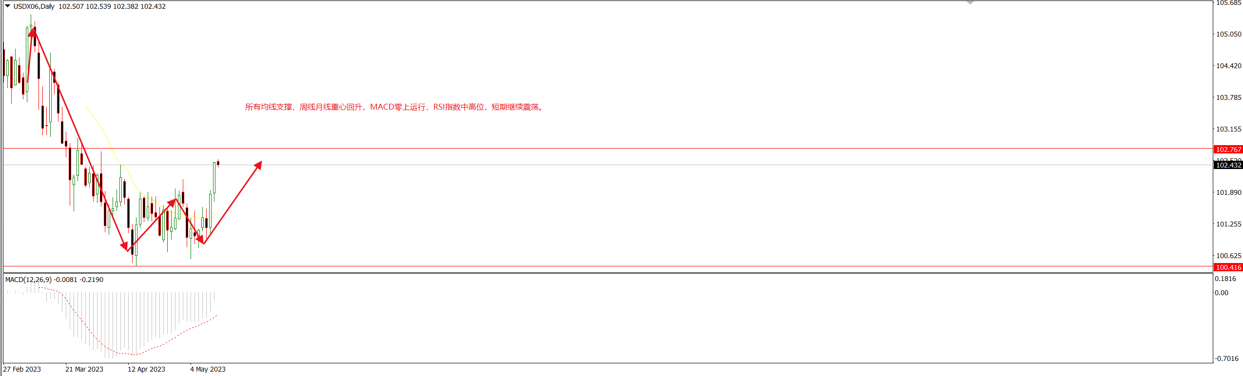 美元指数 美元指数周一下跌 0.26%,报收102.437。美国财政部长珍妮特·耶伦再次警告称,除非美国国会提高或暂停联邦债务限额,否则美国财政部最早可能会在6月1日前用完现金。美国国会众议院议长凯文·麦卡锡15日表示,目前关于避免美国历史性违约的谈判进展甚微。美国总统拜登则在当天宣布了16日与国会领袖会面的计划。尽管双方似乎并没有接近达成协议,但白宫并没有排除设定年度支出上限的可能性,共和党人称,要提高31.4万亿美元的债务上限,就必须设定支出上限。市场正处于盘整状态,等待华盛顿发出的将如何避免美国债务违约的更明确信号。利率 期货 市场预期到今年年底会降息约 50个基点。不过交易员将下个月
