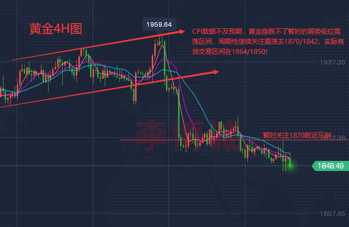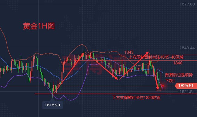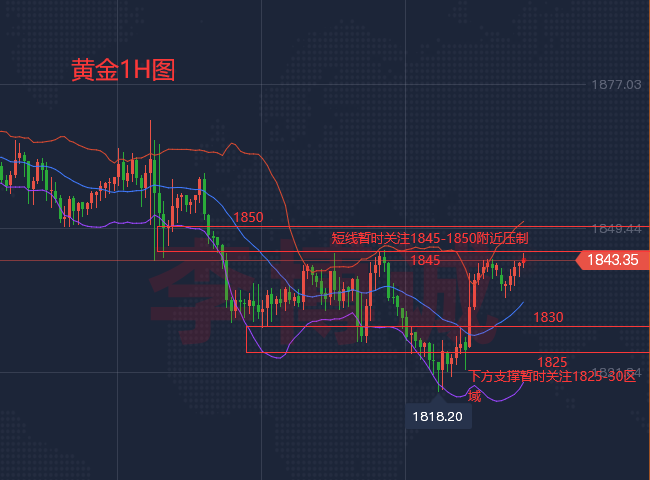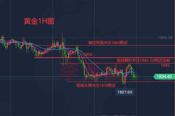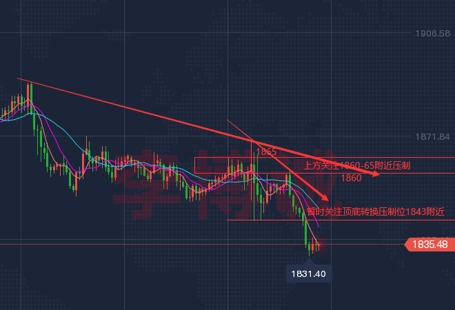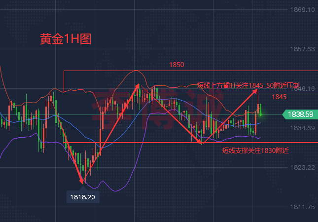 【黄金行情解析】 价格能够突破站上,则节奏上将有望向上切换区间,然后就是四小时紫色趋势线位置1878,这里是趋势分界线,能够站上,多头有更多的主导权。至于下方的支撑,今日早盘分析中给出两个支撑点:第一个支撑点四小时生命线位置1837-1835区域,也与30分钟图的趋势线重合;第二个支撑点四小时下轨1824区域,也与上周五的加速起涨点1826区域相互叠加。 午后价格跌回1837下方后,价格持续震荡走低向下寻找到1831区域,一气呵成的走低下探,当前价格仍是此处低位徘徊。现在压制在生命线的下方,那么关注生命线到下轨的区间,同时留意如图所示的头肩底形态的右键形态情况,能够形成右肩再度确定支撑,后续