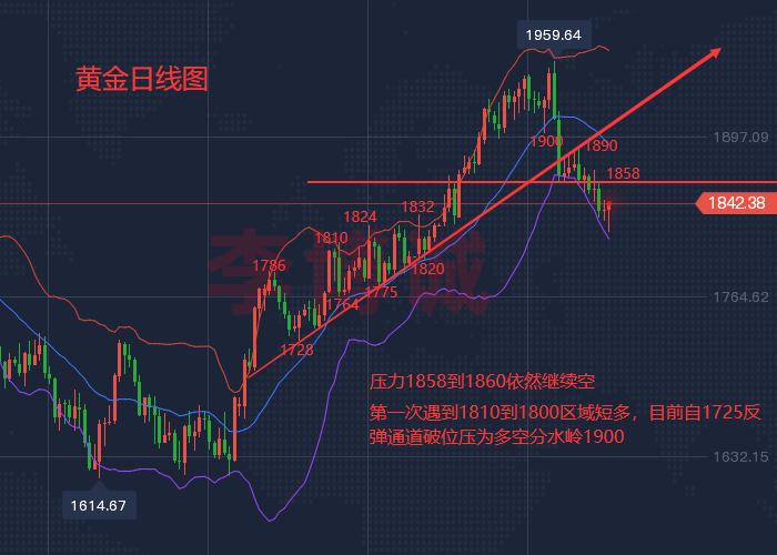 【市场盘点】 周一,现货黄金日内维持窄幅震荡,最高涨至1847.39美元,最终收跌0.05%,报1841.34美元/盎司。现货白银收涨0.43%,报21.82美元/盎司。 美元指数跌破104关口,最终收跌0.06%,报103.88。10年期美债休市一日。 原油方面,两油日内有所反弹。WTI原油回升至77美元上方,最终收涨1.06%,报77.36美元/桶;布伦特原油收涨0.86%,报83.68美元/桶。 受美国总统日假期影响,美股昨日休市一日。 【黄金行情解析】 上周黄金最低下探1818附近,那么自1959一路震荡下跌基本到达140美金幅度, 只有经历这些,你才能明白我们经常说的,历史不会简单