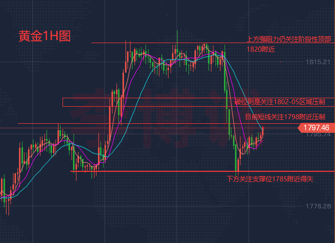 【黄金行情解析】 昨日黄金市场受到美盘利空因素打压快速回落,早盘开盘在1814的位置后行情先拉升日线最高触及到了1820.7的位置后行情区间整理在1813上方,但美盘时段行情受到基本打压行情跌破区间快速回落,日线最低给到了1784.6的位置后行情受到技术趋势线支撑尾盘整理,日线最终收线在了1792.4的位置后行情以一根上下影线基本等长的大阴线收线,而这样的形态收尾后今日的行情区间先空。 那么,咱们今天行情重点讨论两点,第一反弹在哪里空,第二下跌可以去哪里。 第一,周四大跌,日线大阴吞阳,直接跌破5,10日均线支撑点,虽然暂时没有跌破日线布林中轨支撑,但弱势非常明显,这波空头跌破日线布林中轨,