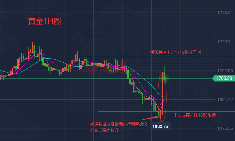 【市场盘点】 周四,现货黄金在欧洲央行公布利率决议前一度触及1680美元,随即大幅反弹,触及1720美元关口,最终收涨1.27%,报1718.02美元/盎司;现货白银呈现深V走势,抹去日内全部跌幅,最终收涨0.95%,报18.83美元/盎司。 美元指数日内波动剧烈,短线下挫后迅速反弹近百点,随后又回吐涨幅,最终收跌0.43%,报106.58;10年期美债收益率大幅下挫,最终收报2.882%;欧元兑美元受欧洲央行意外加息影响,向上拉升近80点,随即急转直下重挫120点,最终仍险守1.02关口。 原油方面,两油盘中跳水,WTI原油日内一度大跌5%后小幅反弹,最终收跌3.1%,报98.92美元/桶