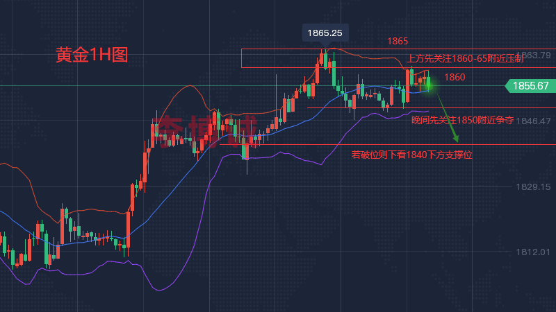 【市场盘点】 周一现货黄金低开高走,亚盘初短线拉升逾6美元,日内多次向上测试1860美元关口,然而受阻回落,最终收涨0.34%,报1856.18美元/盎司;现货白银震荡下行,最终收跌0.2%,报22美元/盎司。 美元指数持续回调,最终收跌0.285%,收报101.37。 国际油价方面,两油震荡上行。WTI原油站上117美元/桶,创3月9日以来新高,最终收涨2.22%,报117.64美元/桶;布伦特原油站上121美元/桶,创3月24日以来新高,最终收涨2.07%,报121.67美元/桶。 【黄金行情解析】 昨日再次上演过山车1853到1863区域横盘整理一天,但是连续三天横盘反弹都是无法收复1