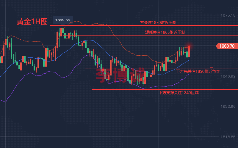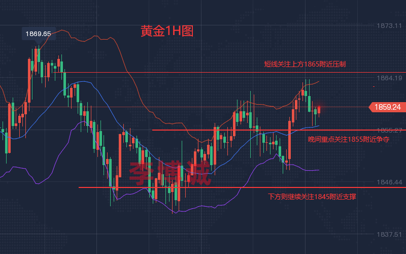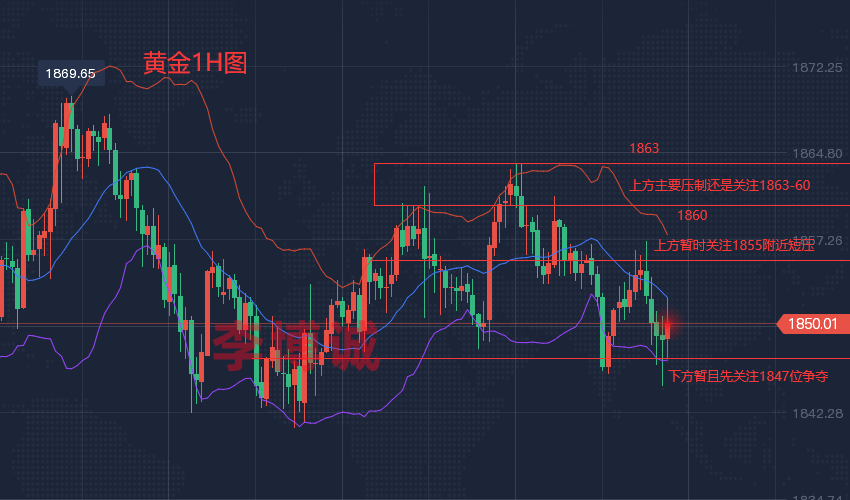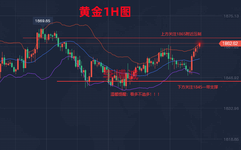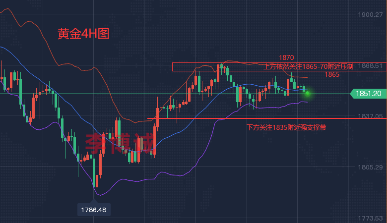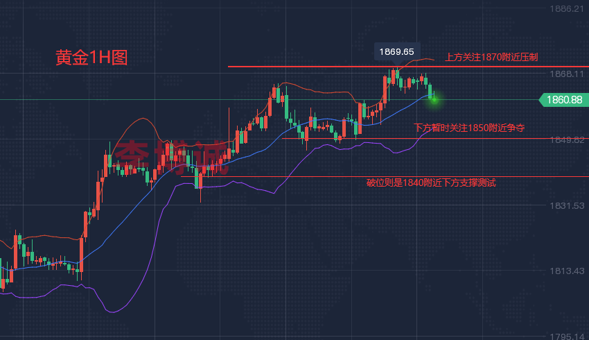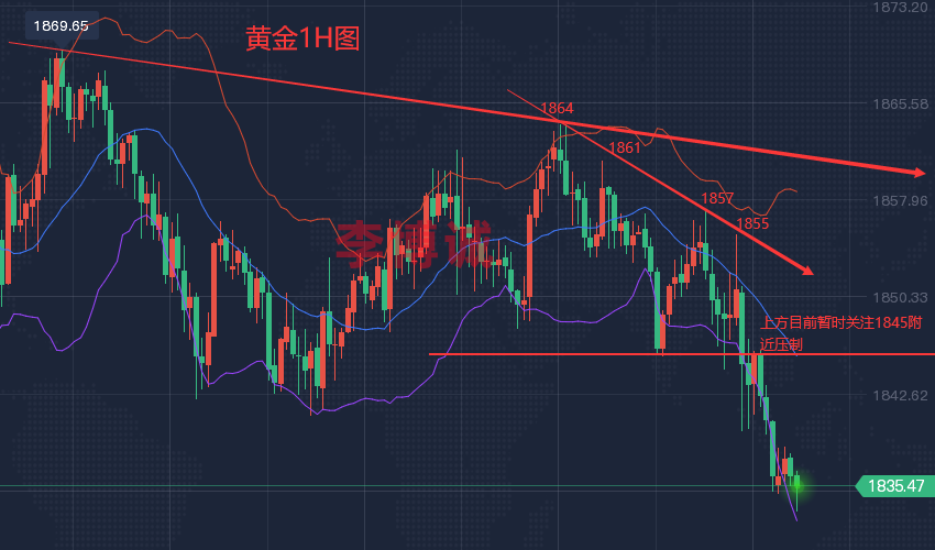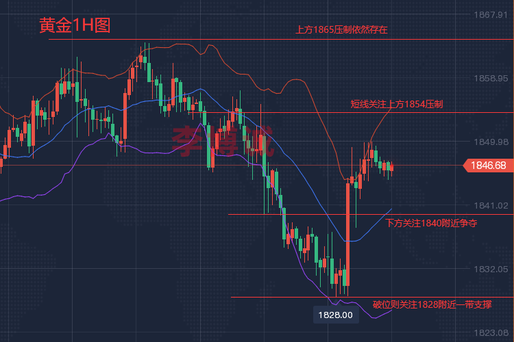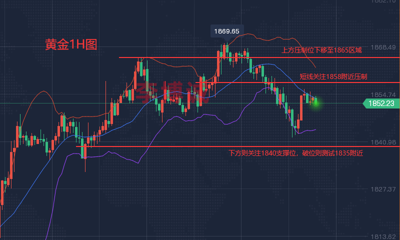 【市场盘点】 周三现货黄金重启跌势,盘中一度下破1850美元关口,美联储会议纪要公布后短线走高,收窄日内跌幅,最终收跌0.67%,报1853.41美元/盎司;现货白银先跌后涨,最终收跌0.44%,报21.99美元/盎司。 美元指数回升至102关口上方,美盘时段回吐部分涨幅,最终收涨0.334%,报102.12。美国10年期国债收益率震荡企稳,最终收报2.751%。 国际油价方面,两油窄幅交投。WTI原油日内最高触及111.63美元/桶,最终收涨0.39%,报110.71美元/桶;布伦特原油最终收涨0.62%,报114.37美元/桶。 【黄金行情解析】 行情如何演变诱多都无法走出天图预期,首先