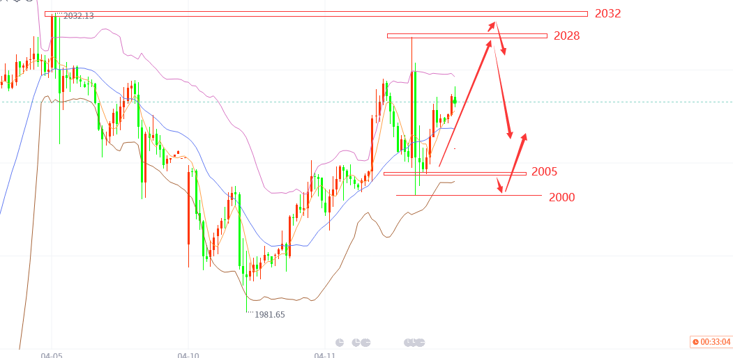 4.12今日黄金行情走势分析: 昨日黄金整体走出震荡上扬走势,早盘从1990开启反弹后盘中最高反弹到2007附近受阻回落,美盘二次回踩1995后再次反弹,整体表现出震荡偏强波幅不大。今日早盘金价直接从开盘点位2002附近直接开启反弹,并且盘中拉升超17个点,仅仅早盘波幅就超过了昨日全天波幅,说明多头从早盘时段已经开始押注上行。今晚还有非常重要的CPI数据,早盘直接拉升稍微有点超出预期。 关键数据前市场一般表现清淡,今天早盘反弹力度却稍显反常,这说明部分多头已经开始提前押注晚间CPI表现不佳。 金价在突破2006-07一线后加速反弹,当前就是底部的多空转换点位;前期多空分水岭则在2013-14