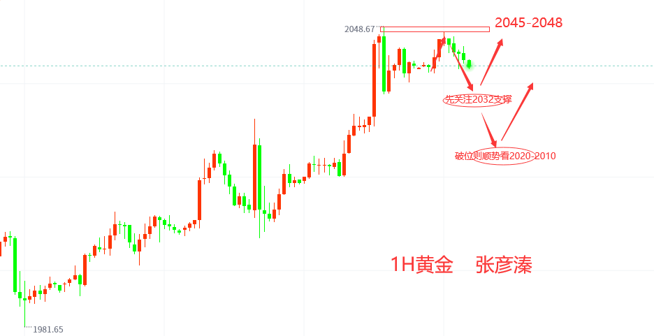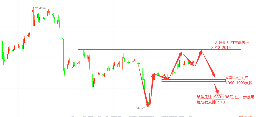 4.18今日晚间黄金行情走势分析: 黄金昨日的2013现价空单策略可谓是赚的不亦乐乎,那么今日该如何去布局呢?首先明确主思路依旧是多头动能衰竭,机构出货结束属于将震荡下跌的路线,加上盘面中至2070高点出现后,目前次高点2048产生属于周线的M顶形态,这是第一重利空。再有美联储的讲话中很明显的表示将保持2%的通胀目标,潜意识就是说5月加息将成定局,属于第二重利空,所以高空是主思路。但此时笔者还不建议去追空,因为看盘面走势昨日下跌后再度反弹至2000关口之上这说明还不是极弱的走势,大概率会进入震荡偏弱的区间运行,个人建议可等待反弹再去空才最稳妥,点位上关注2007-2010开空,短线目标看19