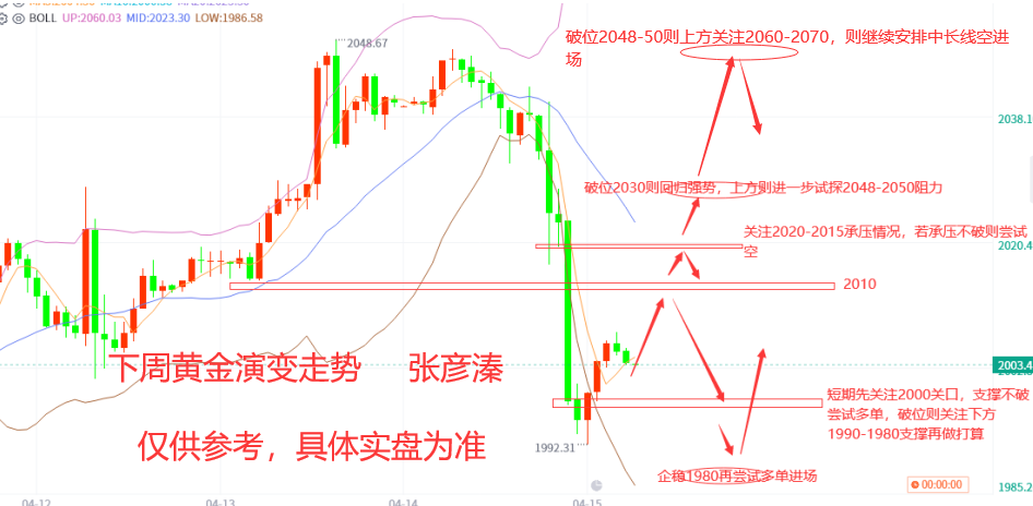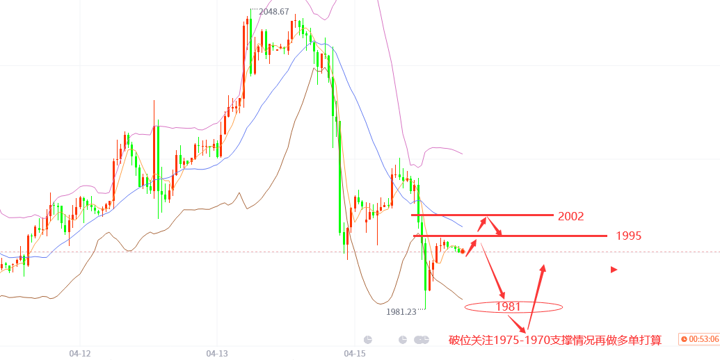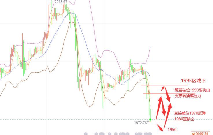 4.19今日黄金行情走势分析: 趋势开始了,此番或将去见1900关口了。先谈消息面从美联储的各方讲话来看对于2%的通膨目标是一定会去执行的,这也就是说在为美元多头造势上涨,同时加息也是对黄金潜在的打压,这是其一利空。其二投机报告中ETF持仓空头大增,表明机构出逃出现变盘的契机,再者当盘面中出现次高点(2048)后形成周线M顶形态压制,很明显黄金上行动能缺乏有进一步下跌的态势,接下来逐步开启高空即可,再上2000关口恐怕已成一场梦,点位上建议可压制下移至1995区域下空,目标持有去看1950支撑带。 黄金具体操作策略: 目前破位1990顶底转换成压力,现在反弹1987到1992区域都是可以闭眼
