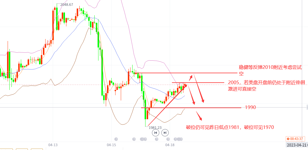 4.18今日黄金行情走势分析: 昨日黄金延续惯性下跌,最低下探1981区域,那么跟随2015跑步空的粉丝再次利润嗨翻全场,经过昨日下跌以后,目前压力下移2008区域,也就是说如果黄金反弹遇到这里依然可以做空进场博弈再次下跌。周五黄金大跌50美金幅度,再次验证2030上价格黄金多头都是动能衰退,日线周线形态看下跌还有望延续,周五银行财报没有市场预期悲观,那么就是说硅谷银行倒闭破产是个例没有延续到其它金融银行领域,避险暂时消退,那么数据行情都是暂时靠边,前期黄金大幅上涨以后获利回吐也是情理之中,同时从ETF持仓看连续三天减持2吨多黄金,说明对2050上空间不看太远,技术看目前压力下移2008区域