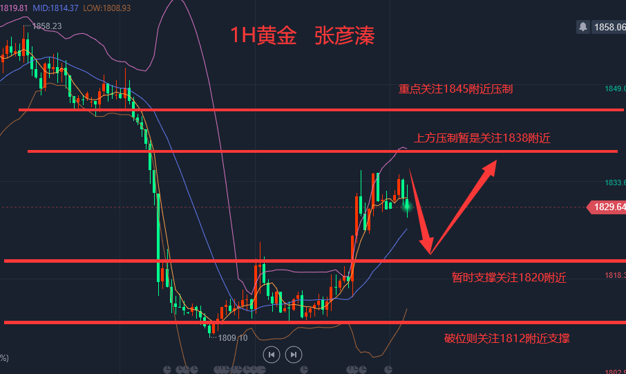 消息面解析: 周三ADP数据之后短期对美元的利好也是告一段落,隔夜美国初请失业金数据创近期新高,就业市场存在一定不确定性,市场对今晚上的非农也产生了更多的期待,美元指数拉高之后也是再度走出有效的回踩,在都看好的时候,突然出了不好的数据那么市场消化肯定是超范畴的,所以原本影响不会那么大的数据在有些时候就会被放大,晚间就关注非农数据给市场定阶段性的基调了! 【黄金】 上个交易日早盘继续维持小区间窄幅震荡,低点从周三的1809上移到了昨天的1811,欧美盘开始震荡向上突破,美盘初请失业金数据公布之后也是强势拉高一度触及1835一线然后承压回落1825一线,短期支撑也是逐步上移到了1820-22这个
