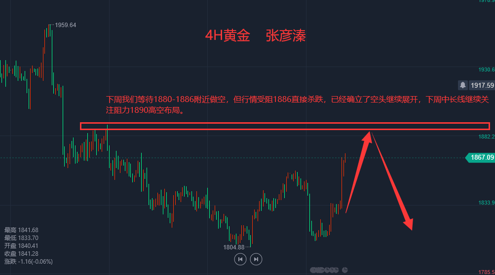 黄金分析: 目前黄金最高是达到1930,说实话这个位置已经是属于多头的危险区域了。 1804-1959这波趋势,1930正好处于这波趋势的80.9%位置。 那么就证明1930这里肯定是有压制力的,所以今晚首先肯定的是不能追多。 其次我们在看周线图,周线黄金从1614开始上涨,达到1959后,来了一波回调浪,直接到1804.周线目前就是一个abc的浪形,可以看到我图中画了123求4,上方压制点382在1935-36这里。所以根据日线图和周线图分析,黄金今晚的压制点就是在1930-35这里。我觉得黄金后市如果继续触及到1930-35这个区间那么就可以大胆的去做空,防守止损1940,下方目标首先