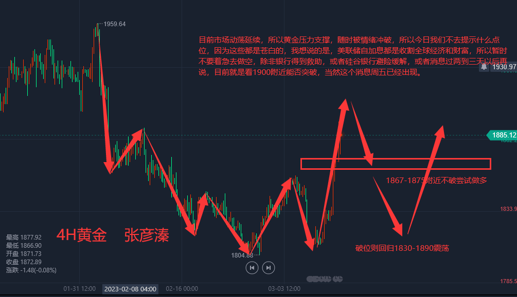 消息面: 早盘受到美国SVB事件推动之下,引发避险情绪升温,黄金直接跳空拉升,盘中最高触及1894一线。现在所谓趋势技术在消息面前什么都不是,2008年两房危机导致雷曼兄弟破产,黄金当然上140美金,随后澄清资金充沛,黄金回落90美金。在有后期破产又是来回震荡100美金,虽然硅谷银行是雷曼20%体量,但是对金融银行动荡不可避免,至少说明美联储加息收割全球,和掠夺财富暂时高一段落。 目前市场动荡延续,所以黄金压力支撑,随时被情绪冲破,所以今日我们不去提示什么点位,因为这些都是苍白的,我想说的是,美联储自加息都是收割全球经济和财富,所以暂时不要着急去做空,除非银行得到救助,或者硅谷银行避险缓解,
