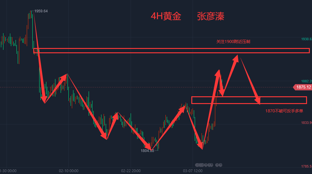 消息面: 黄金上周五非农强势大涨,触及1870一线大阳收盘,短线凸显强势,往往一步到位的行情延续性有限,上周下跌是这样,这次上涨会不会也是如此?中长线能否真正转多,要等月底加息后才能确定,硅谷银行破产美储陷入两难境地,不加息通胀下不来,加息银行先倒下,对三月份加息会不会有影响还需观察,两权相害取其轻,看美储态度保哪一边,之前市场预期加息50个基点,若保持不变那么反弹可能是为后面下跌留空间。而ETF黄金上周减仓10.7吨,持仓降至新低901吨,是否意味着对大趋势多存有疑虑。 黄金分析: 今日早间黄金高开测试1890回落,小时线上连阴单阳,两次触及承压回落,重点关注欧盘走势,下方支撑看1870—