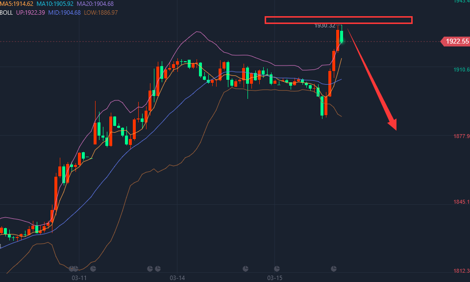 消息面: 由硅谷银行倒闭引发的避险升温,银行板块股票全线大跌,黄金昨日高开高走,强势突破千九关口,触及1914高位收盘,日线强势大阳。避险情绪一时不会消散,日线连阳大涨,突破前期反弹高点,站上618压力位,无论如何也要先多,顺势而为即可。目前对于美储三月加息市场预期退却,后续重点关注美储态度。今晚有CPI数据公布,对黄金影响较大,如果CPI继续升高,不排除美储坚定加息步伐,强势推进。 3.14今日黄金走势分析: 对于日内黄金,早间回撤修正,午后顺势低多,重点博弈欧盘续涨破高,美盘回踩才可以看延续多。关注1896一线多,破1890损,目标看1912—1916。上方压力在1918—1927.