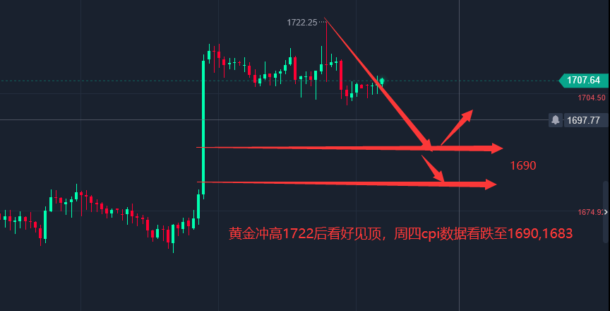 11.10今日黄金走势分析—— 周三分析美元在109有反弹空间,最低在109.2,成功反弹至110.5,随着美元这波反弹,黄金也在冲高至1722后走出回落,前面讲过,美元在这个周期还是多头趋势下的高位震荡,只要美元保持在109之上,还有大涨的机会和空间。日内市场迎来CPI数据,或继续刺激美元走一波上涨,上方或看111.5,相对来讲,美盘下跌或见1690,1683! 近期投资者都在聚焦美中期大选情况,11月9号公布了大选结果,共和党在期中选举中的收获似乎比一些人预期的要小,投资者还关注即将公布的通胀数据,以判断未来加息的幅度。市场还将关注本周美国10月份CPI数据,多数分析师认为会通胀增速会略