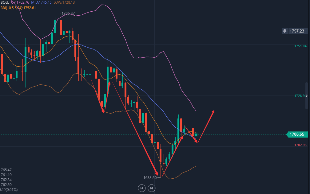 ——黄金分析—— 原本日线级别,昨日冲高收阴,刺破短期下降通道上轨,仍处于弱势压制格局中,有望今日延续下滑,但日内却出现了一路的反弹上行,甚至刺破昨日高点,形成了V走法,此时日线阳K线又突破通道上行,接连的突破,可能预计下周会展开一波震荡氏反弹修正,暂时结束下跌通道弱势打压,不过后面会有两处压制,一个是中轨1740下,一个是2070压制下来的大级别通道上轨1760下,这两个位置下承压,仍会打压金价走弱风险;另外在月底美联储加息落地前,市场会不断炒作加75基点,在落地前是很难有大幅拉升空间的,而落地后,可以干一次低多,反弹空间会有; 另外,日内持续逼空拉升,欧盘始终无法突破1730,或站上17