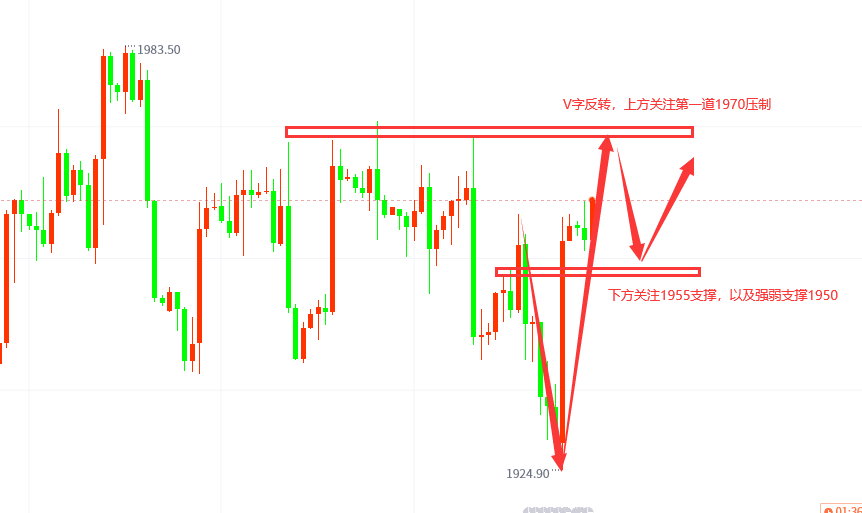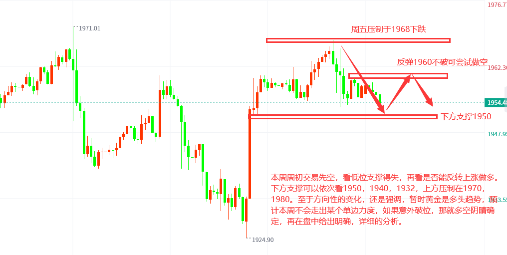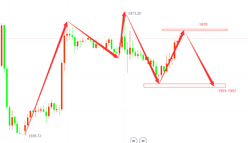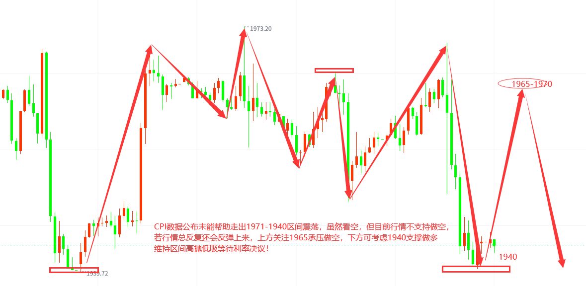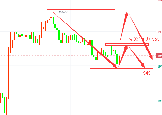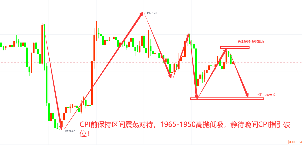 6.19今日黄金行情走势分析: 今日周一,早间,黄金开盘1957一线,开盘即陷入震荡,黄金目前最高1958一线,最低1956附近,整体来说,黄金早间开盘行情不大。那么对于周一而言,说句实话,彦溱我并没有什么太大期望,原因就在于信息面以及交投太过于缺乏了,况且今日又是美节假日,市场会提前休市,从而进一步限制了行情的波动,对此,对于今日而言,彦溱我个人认为,黄金大概率会陷入震荡拉锯当中,至于是局限于1960-1950小范围震荡,又或者说是1965-1950区间震荡,那就交给市场,但是今日的话,不看好会上破1970以及下破1950 上周消息众多,重点关注的是CPI和美联储利率决议,周二公布的CPI