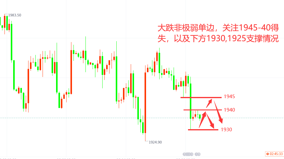 消息面解析: 美国5月未季调CPI年率录得4%,低于预期4.1%和前值4.9%,为连续第11次下降,创2021年3月以来新低;5月季调后CPI月率录得0.1%,也低于预期0.2%和前值0.4%。美国5月未季调核心CPI年率录得5.3%,与预期一致,较前值5.5%有所回落;核心CPI月率录得0.4%,较预期0.4%和前值0.4%持平。 美国CPI数据公布后,美元指数短线跌幅扩大至30点,最低至103.06。现货黄金短线下挫后上涨,波幅达20美元,最高报1971.01美元/盎司。截止到目前为止,黄金在触及1970后,再度快速下跌,目前最低是达到1940附近。 6.14今日黄金行情走势分析: 目前