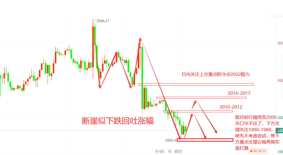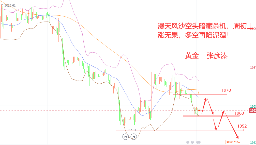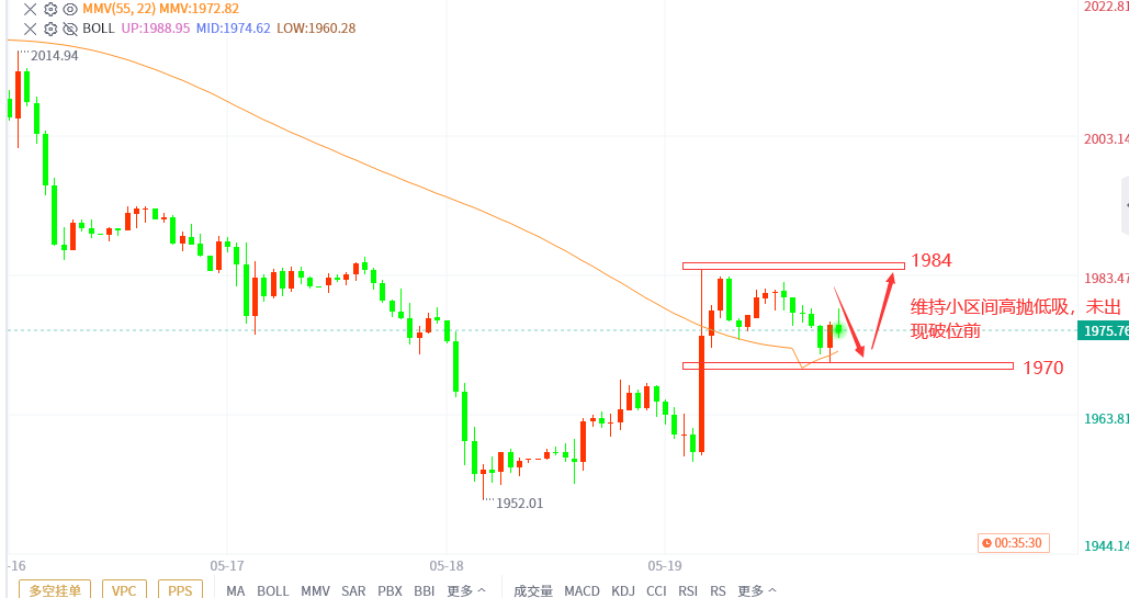 5.17今日黄金行情走势分析: 黄金现在的方向不用多说了,还是跌!那些想抄底的,自己去面壁思过!彦溱已经说了多少次了,破位是大概率,现在刚破位,就想这反转,除了异想天开,没有其他合适的词! 早盘的反弹力度比较弱,维持1993附近徘徊,属于上涨无力,反弹遇阻!那这个压力位置就是再次尝试做空的位置了,所以彦溱果断1992现价直接空,行情应声而跌! 最近的走势大家也看到了,亚欧盘都是窄幅运行的,磨磨唧唧,真正的行情还是集中在美盘,所以现在的空单,估计又要等一段时间!方向对了,不怕路远,喝茶,看戏!静待下行即可!下方的目标就是此前1980-76区域的支撑! 具体策略 黄金稳健反弹至1998-96空,
