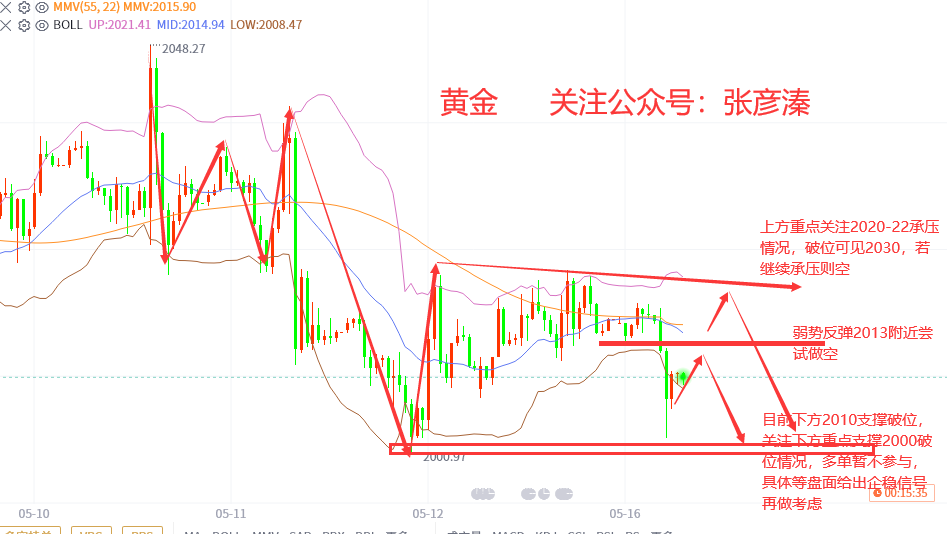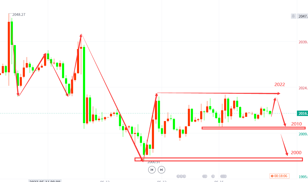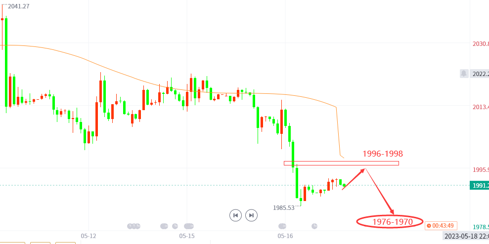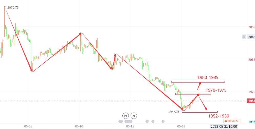 基本面解析: 近期市场关注本周包括主席鲍威尔在内的更多美联储决策者的发言。美国总统拜登和共和党籍众议院议长麦卡锡进入债务上限磋商的关键一周,希望他们能在支出水平和能源法规方面找到共识,以避免出现毁灭性的债务违约。美国财政部长耶伦再次警告称,除非美国国会提高或暂停联邦债务限额,否则美国财政部最早可能会在6月1日前用完现金。美国国会众议院议长凯文则表示,目前关于避免美国历史性违约的谈判进展甚微。美国总统拜登则在当天宣布了16日与国会领袖会面的计划。日内等待美国参议院银行委员会就硅谷银行和签名银行破产事件举行听证会结果。 5.16今日黄金行情走势分析: 周一讲过,黄金要延续上周的下跌走势,波段可逐