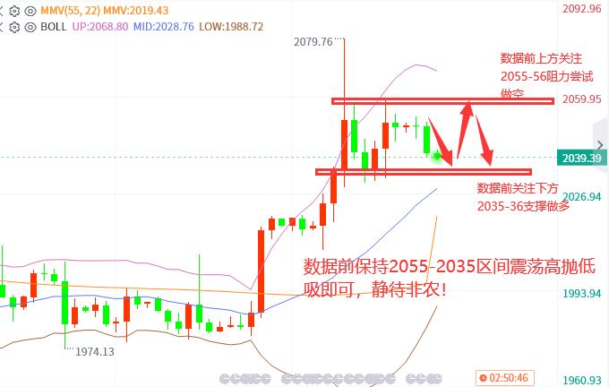 ——黄金白盘震荡良久,静待晚间非农数据洗礼,多空如何抉择?—— 昨日黄金开盘旱地拔葱,刷新历史高点到2079附近后快速回撤,白盘多次回踩2031-33附近出现反弹,我们在该点位两次接多均成功兑现利润。美盘时段最高反弹到2059附近,早间的拉升就已经抬高了做空的点位,彦溱在白盘复盘强调做空只能在2055上方。今日晚间将公布非农数据,这一次的非农数据将进一步决定美联储的降息路径,若数据表现不佳金价有可能再次刷新历史高点。反之,若本次非农表现良好,则金价可能会回吐部分涨幅再次回归震荡。 晚间非农万众期待,今天白盘就不会有太大的动作,昨日尾盘冲高回落已经确认了上方关键阻力2057-60一线,短期阻力