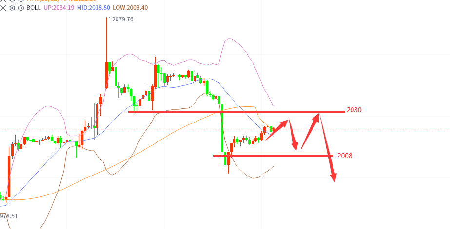 行情回顾: 昨天开盘在2015附近,早上开盘后小幅回踩触及2014一线后震荡反弹,欧盘最高反弹触及到了2027附近,美盘时段黄金如期下跌,最低下跌触及到2017附近,随后黄金再次反弹,尾盘冲高2029一线回落收尾,最终在2021附近收盘,昨天整体波幅不大,走了一个小幅的区间震荡行情,日线以一根上影线较长的倒锤头形态收线,而这样的形态收尾后,黄金上方压制明显。 5.9今日黄金行情走势分析: 今日而言,多空的选择,在我个人看来还是应该选择做空,为何呢?首先,黄金当前触顶已是事实,如果要是美经济数据表现不佳,从而进一步限制加息,又或者经济局势放缓等其他因素升温,那黄金可能还迎来震荡走高,但是目前市