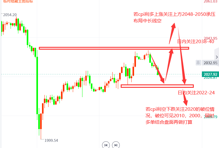 5.10今日黄金行情走势分析: 本周开始黄金陷入典型的窄幅震荡格局,连续两天均维持在2030-10区间盘整。特别是昨日周二基本一直在2030-22小区间震荡,我们在2030附近连续三次做空均成功迎来短线下跌。不过昨日尾盘时段金价小幅上探最高从2038附近开启回撤,当前市场交投是非常清淡的,今日晚间的CPI数据在很大程度上将决定美联储对于后市加息路径的选择,在数据公布之前大概率还是以2024-38高位震荡为主。 今晚20点30分,美国将公布4月CPI数据,目前市场预计其同比增速为5%,与上月一致,核心CPI同比增速较上个月放缓,为5.5%,但预计CPI环比增速有所加速,由上个月的0.1%上升至