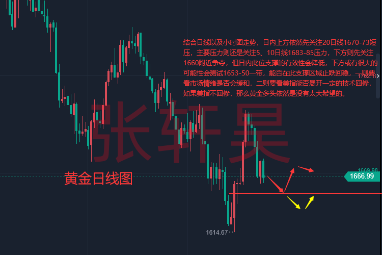 1.市场消息面: 10月12日讯 日内欧盘时段,现货黄金小幅反弹,目前交投于1669美元/盎司附近。美元指数从近两周高点小幅回落,为黄金反弹提供支撑,但美国财长耶伦在讲话中为美元继续上涨开“绿灯”,黄金反弹料无法延续。 【美国财长耶伦认可强势美元 策略师:做空美元时机尚未来到】 今年美元几乎势不可挡,美国财长耶伦周二在CNBC节目中表示,“由市场决定的美元价值符合美国的利益”,美元的强势是全球央行不同货币政策立场的“合乎逻辑的结果”。策略师表示,耶伦对强势美元的认可将有助于推动该货币进一步上涨,这让投资者目前没有理由做空美元。 从日本到智利的央行已经介入,试图保护本国货币免受美元冲击,但这些