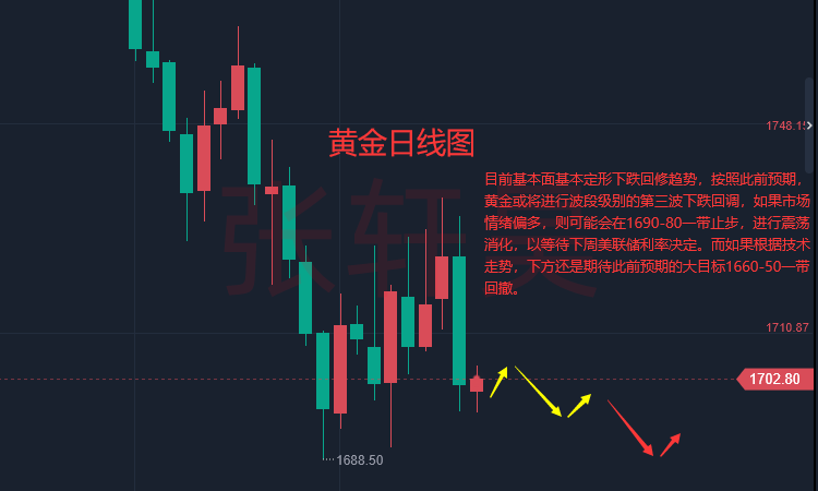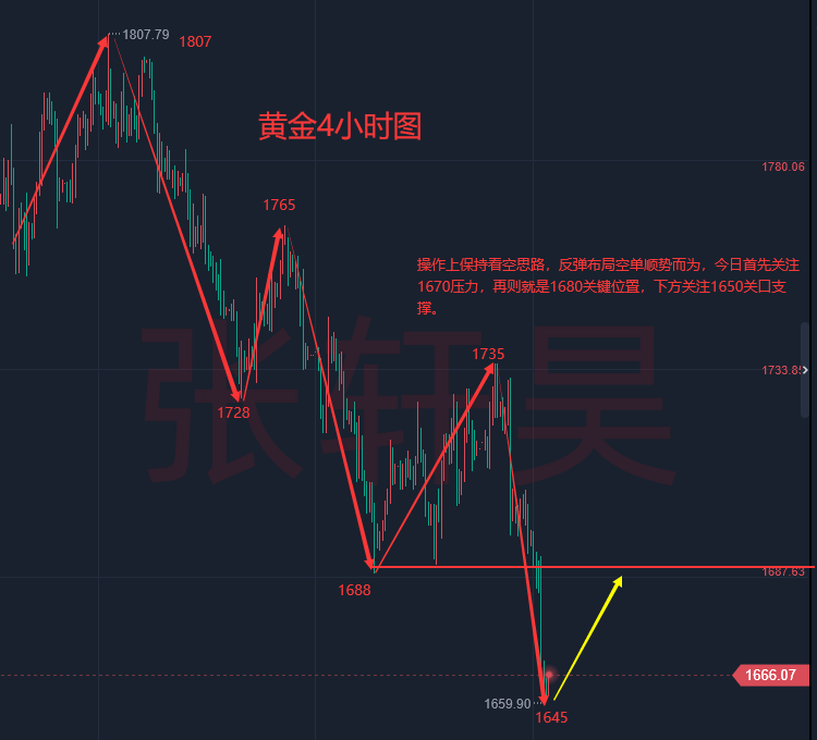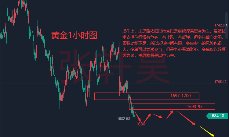 1.市场消息面: 周三(9月14日),黄金跌破了1700这一关键关口,因对美联储将大幅升息的预期令这种非收益贵金属的光泽有所减弱。 美市尾盘,现货黄金收报1697美元,日内最高触及1707,最低触及1693美元。黄金在美国CPI数据的推动直接行情直接崩盘,随即陷入一天一夜的震荡格局。 美国劳工部周三公布的数据显示,8月份生产者价格指数(PPI)连续第二个月下降,不过较上年同期增长8.7%。此前一天发布的消费者物价指数(CPI)强于预期,加剧了人们对美国通胀广度和速度的担忧。 2.黄金技术面分析: ①、周二CPI爆冷利空,且市场显示9月加息75个基点已经成事实,此时大涨,黄金承压下行触及169