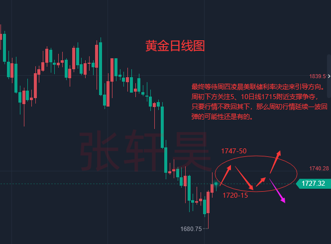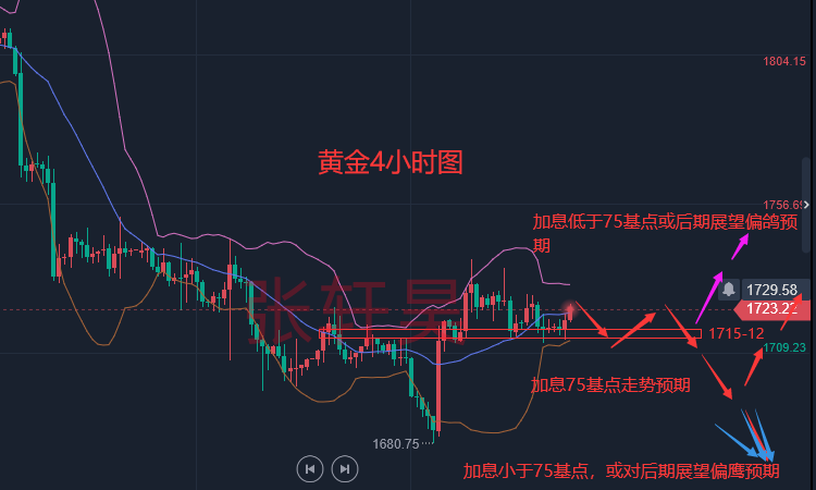 1.市场消息面: 7月27日讯,明日凌晨,美联储就将公布7月份的利率决议,市场对加息75的预期已消化过久,如不出意外,甚至预计行情不会有较大波动。黄金昨日冲高1728美元后回落,但晚间又在1715附近止跌回升。周三日内,黄金窄幅震荡。截至午后,报价在1719.8美元/盎司。 美联储利率决议加息75或已无悬念,黄金只等靴子落地 周四凌晨2点,美联储就将公布最新的7月份利率决议,市场普遍预期美联储将降息75个基点。利率期货显示美联储加息100的概率仅为24%;投资者需要重点关注利率决议的鹰鸽倾向,因为至少要加息75个基点,偏向鹰派的可能性要略微大一点,但投资者更关注年内剩余时间的加息安排。分析人