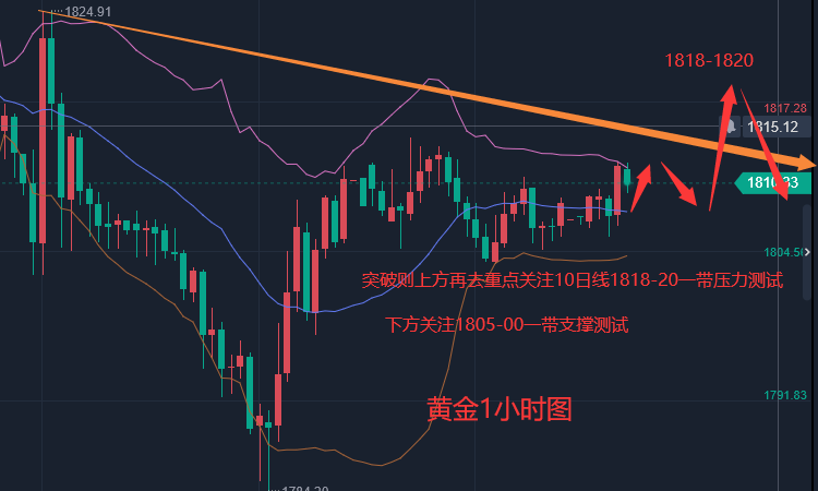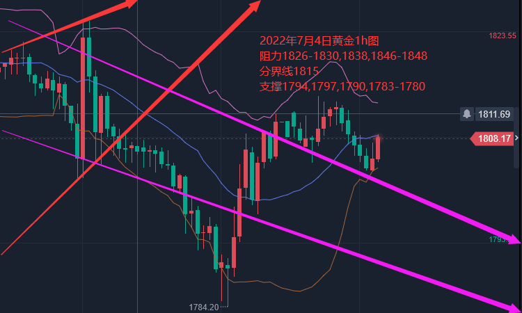 1.市场消息面: 7月5日周二亚市盘中,国际黄金走势震荡下跌,金价早间开盘价格1807美元,最高涨至1812美元,最低跌至1800美元,目前交投于1804美元附近,短线价格波动偏弱。 最近一段时间,全球央行加息前景,打压金价下跌,不过黄金跌幅相对有限,日内美元拉升,刷新近二十年以来的高位,金价也仅仅是从日内高位回落十美元,本人认为,之所有会出现这种情况,是因为基本面利好因素继续支撑金价,主要包括市场对高通胀、地缘局势以及经济衰退的担忧,一直挥之不去,这增加了黄金的吸引力。 消息方面,货币紧缩可能会持续,美国经济可能会出现技术性衰退;本周将公布美国6月非农数据,市场预计失业率上升幅度可能超出预