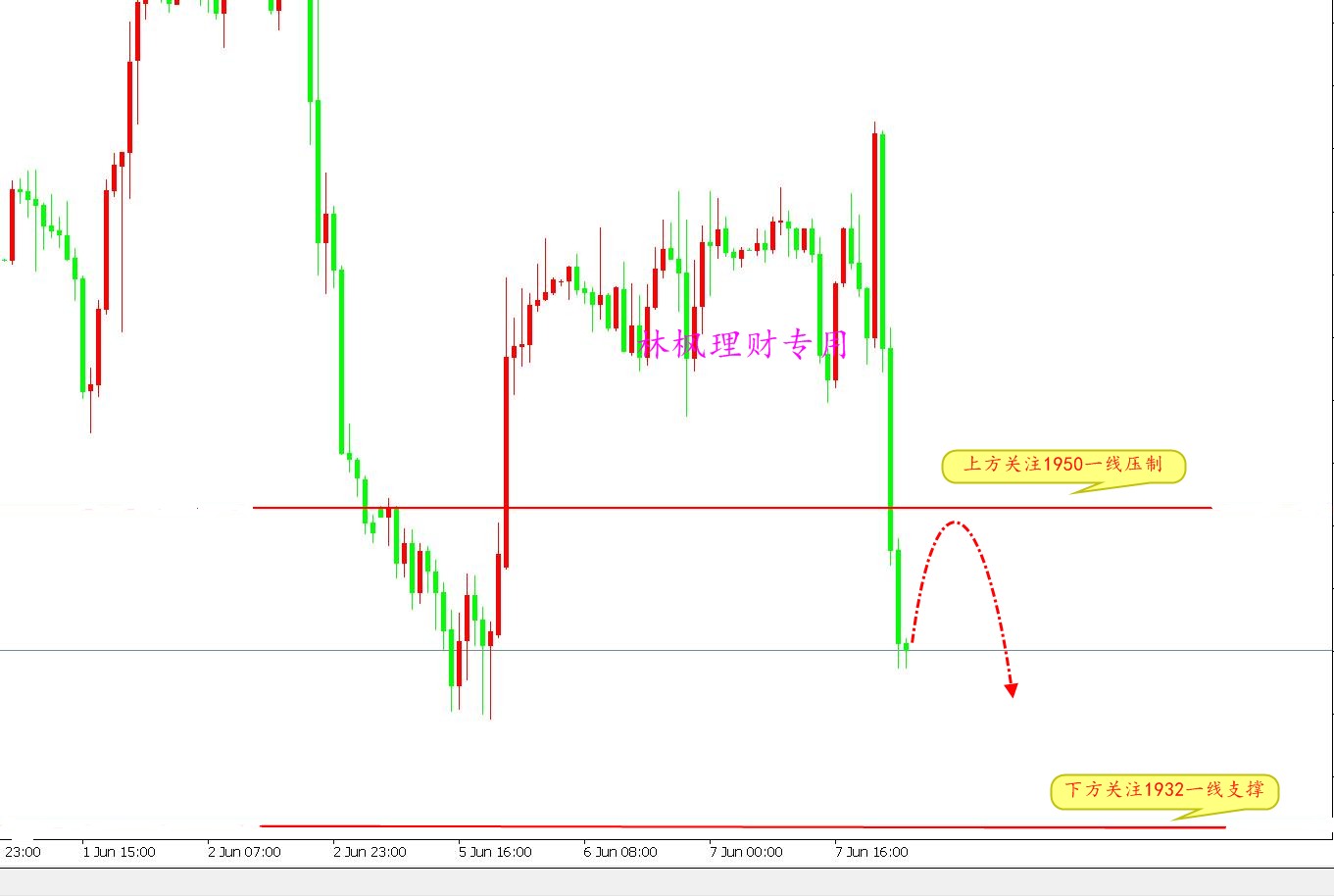 林枫理财:晚间冲高回落,日内看延续 大行情抓不住,小区间拿不准,不是在抗单就是在扫损!相信很多投资者朋友都遇到过的问题,那么问题的症结出在哪里?原因很简单,因为你做单没有章法、不懂理性,总是在追涨赶跌,凭感觉做单。或是老师实力不济,屡屡将你带偏,小赚即出,大亏却一个不漏!当你拿着大把的本金进入这个市场,你本来有大赚一笔的资本,但却将一把好牌打的稀巴烂。做单,首看趋势,其次看点位!有理由的操作,这才是投资!佛渡有缘人,我带有心人! 黄金的空单等了两天,终于在凌晨迎来一波预想中的瀑布,周二在1965这里一直喊空,黄金一直维持区间震荡,小小的十美金区间打完全场,让我们等待单边的人大失所望,好在短线