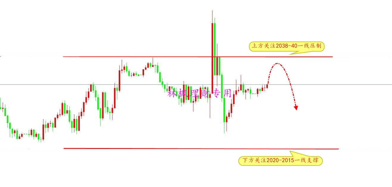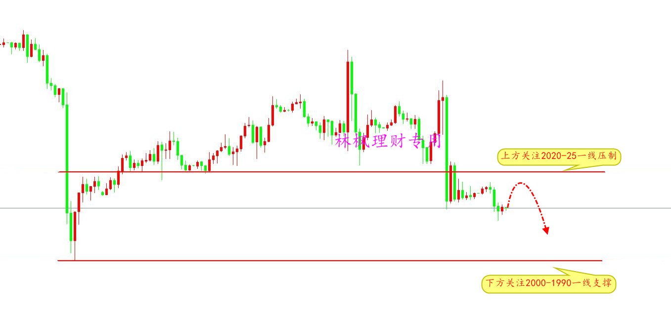 林枫理财:顶部已经形成,2020一线继续空 昨日黄金围绕2006到2022区域震荡,总体还是弱势明显,虽然有所反弹,但是没突破压力区域,同时周线连续两周在2050冲高出现上影线,说明压力明显,而且ETF黄金连续减持说明后期上涨空间不乐观,技术看日线均线压力逐步下移,目前集中2026区域,也就是说多头不能大阳突破这里,随时气势动能衰退就是破位下跌,毕竟自3月银行破产倒闭高开的缺1867没有回补,同时目前看伴随加息进入尾声,银行破产也是稍微缓解,自然避险不那么强烈,消息增大波动的幅度和力度,不会改变趋势,当价格上涨你发现所有消息都是避险,当价格下跌所有消息都是利空,典型的配合你的情绪追涨杀跌,所